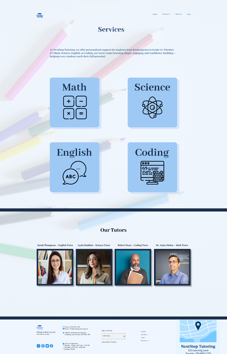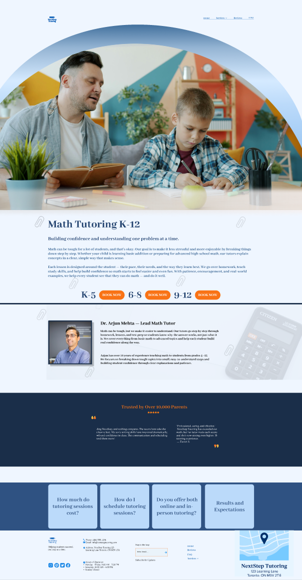 This project focuses on the design of a responsive tutoring website with an emphasis on clear information hierarchy, structured layouts, and intuitive user flow. The goal was to present educational services in a way that feels approachable, organized, and easy to navigate for both parents and students.The site was designed in Figma, applying grid systems, spacing, and consistent visual language across pages. This project demonstrates my ability to translate layout-driven design principles into functional digital experiences.